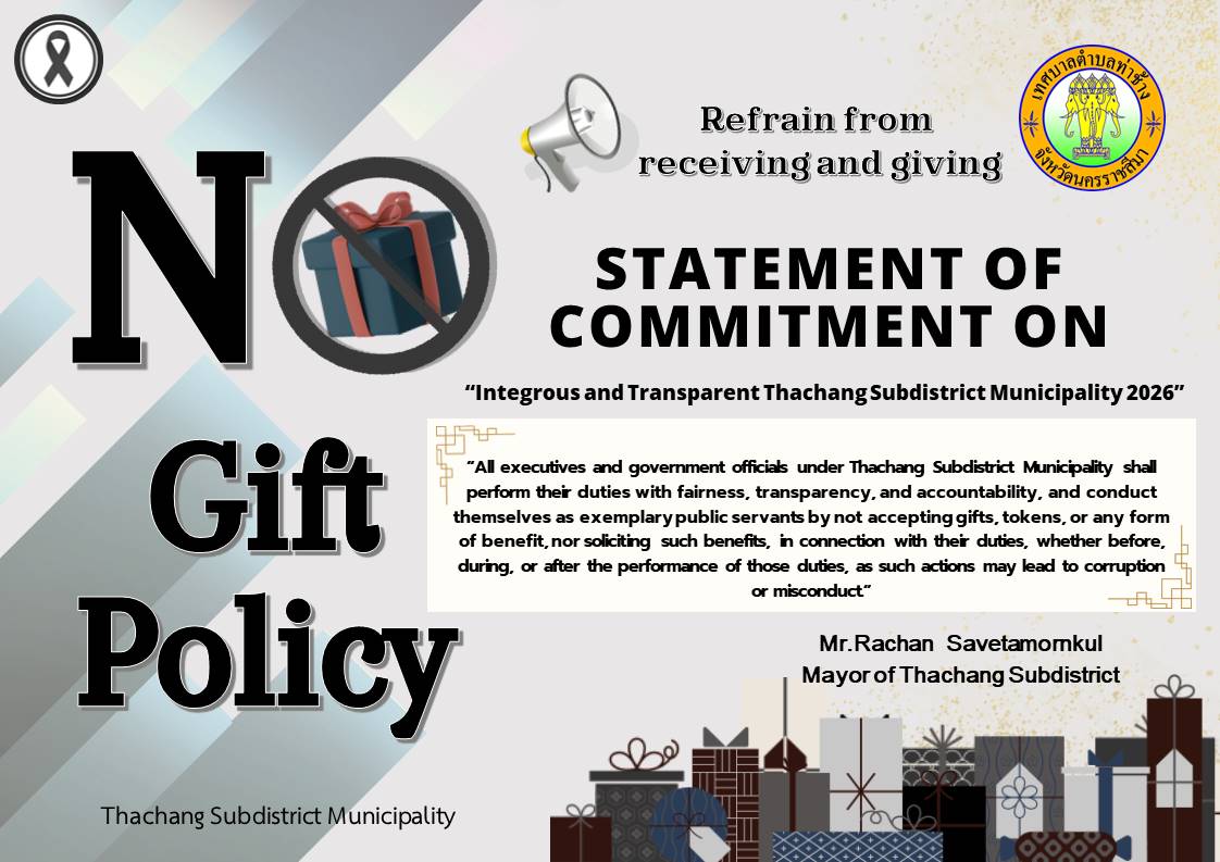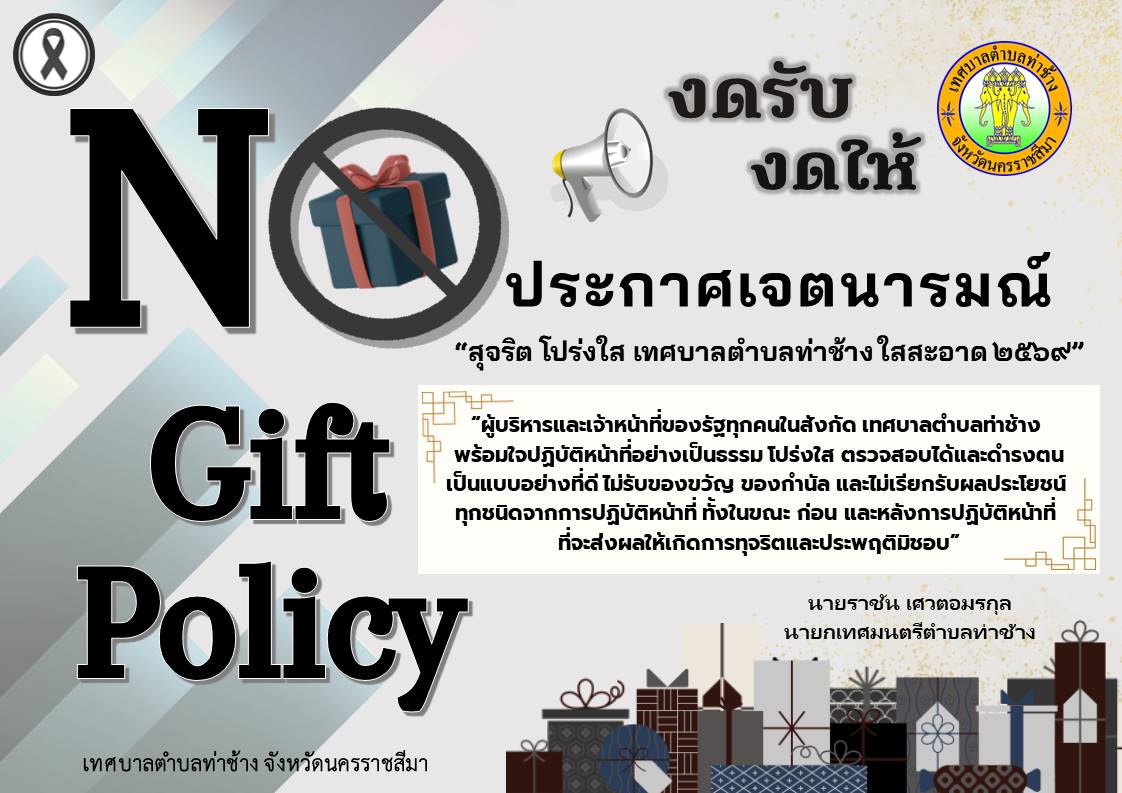 ประกาศเจตนารมณ์ “สุจริต โปร่งใส เทศบาลตำบลท่าช้าง จังหวัดนครราชสีมาใสสะอาด 2569” และ “งดให้ งดรับ” ของขวัญ ของกำนัลทุกชนิดจากการปฏิบัติหน้าที่ (No Gift Policy)